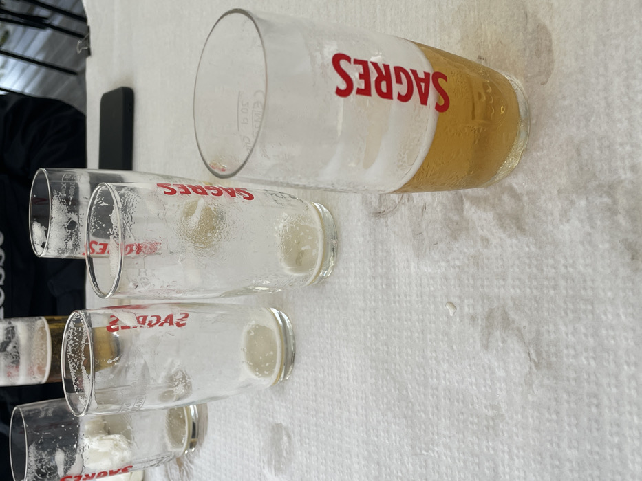 - "Several Sagres beer glasses lay on a white, textured surface, likely a paper towel or tablecloth" by FM-yU2qz2, licensed under CC BY 4.0