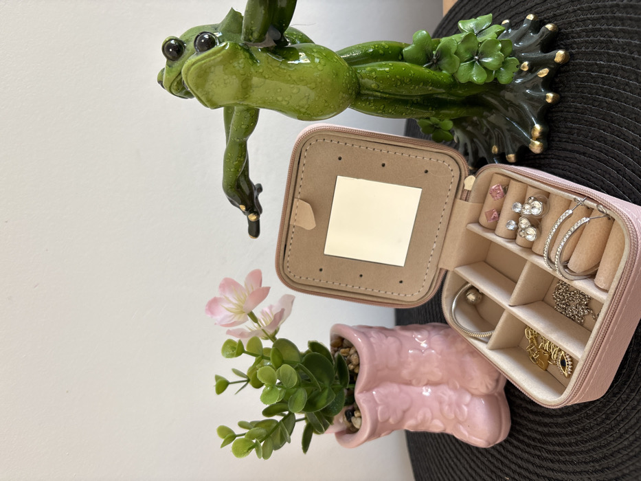 The scene depicts a tabletop arrangement of decorative items and a jewelry box in an indoor setting in the city of Sofia, Bulgaria. A dark, woven mat serves as the surface for the items, set against a plain, light-colored wall. On the left, a small artificial plant with green leaves and two light pink blossoms is contained within a pink, ceramic boot-shaped planter filled with small pebbles. In the center-right foreground, an open, rectangular, pink-toned zippered jewelry box reveals a beige interior with multiple compartments. The lid features a small, square mirror. Contents of the jewelry box include a silver-colored charm bracelet, a gold-colored necklace with an "evil eye" pendant, a silver-colored chain necklace, two pairs of stud earrings (pink and clear), a pair of clear dangle earrings, and a silver-colored bangle bracelet. To the far right, a glossy green ceramic figurine of two embracing or dancing frogs stands upright, with their limbs extended and a dark green base adorned with golden accents and clover-like elements.