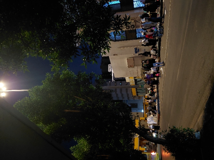 A nighttime street scene presents a group of people lined up along the edge of a sidewalk, potentially for an event or waiting for something. Buildings are visible in the background, illuminated by streetlights, which cast a glow on the surroundings. Trees and shrubbery frame the image, adding depth to the composition. The overall ambiance is one of urban activity under the cloak of darkness.
