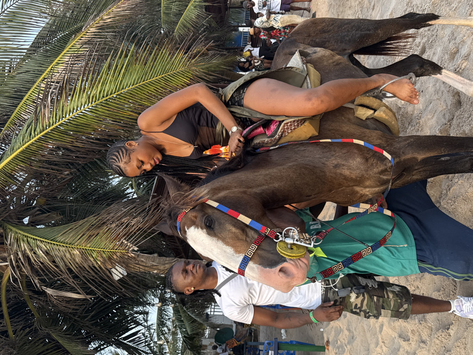 A woman sits on a brown horse on a beach. The woman has braided hair, a black top, and dark shorts. The horse has a colorful bridle. A man in a white shirt and camouflage shorts stands beside the horse, holding its reins. Palm trees are visible on the left side of the image. Other people can be seen in the background. The ground appears to be sandy.