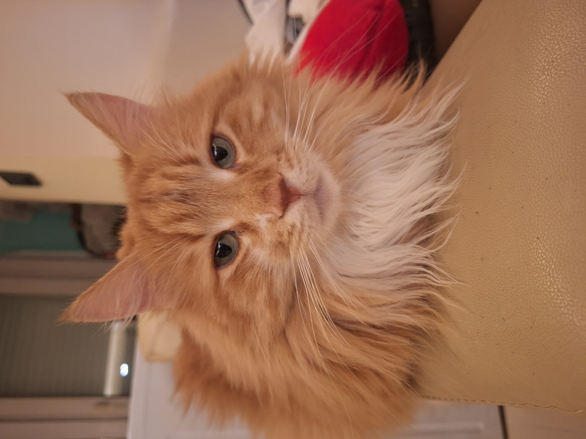 - "A close-up image features an orange cat with long fur, lying on a light tan leather or faux-leather surface" by FM-rIr6y1, licensed under CC BY 4.0