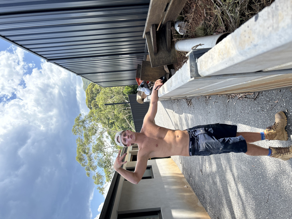 A shirtless young man, wearing a backwards baseball cap, navy shorts, and work boots, stands on a concrete path. He flashes a peace sign with his left hand and holds his phone in his raised right hand, presumably taking a selfie. Behind him, a grey fence, some trees, a house, and a cloudy sky are visible. The photo appears to be taken outside on a sunny day.