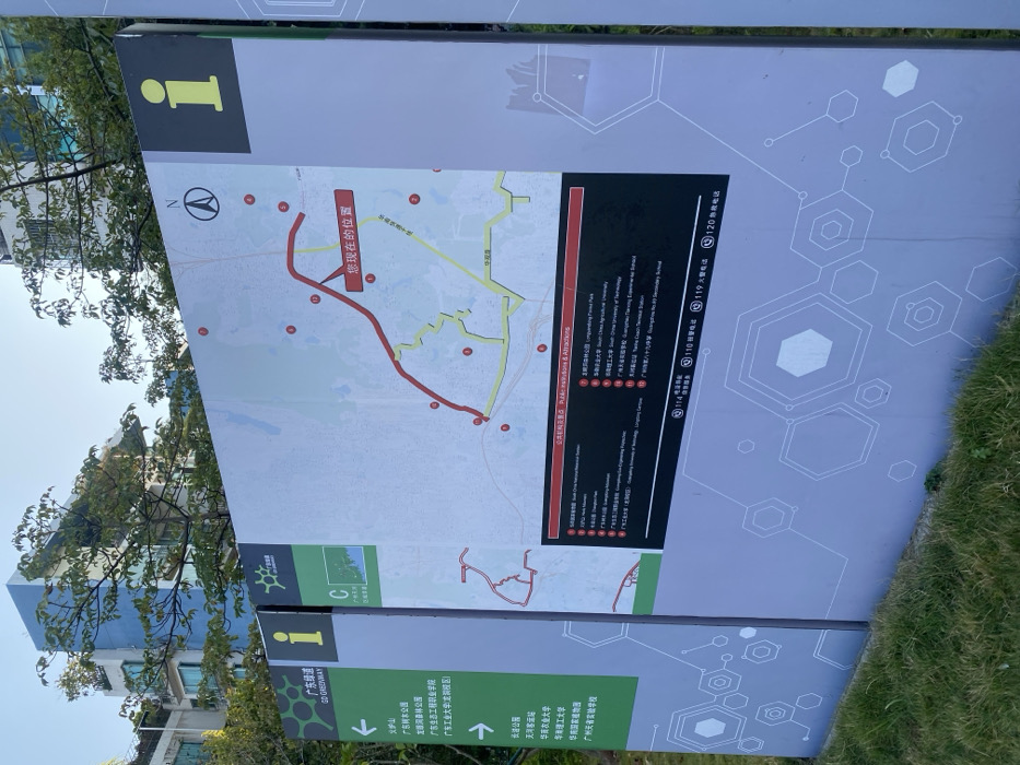 n outdoor directional map. It displays a map of a greenway with points of interest marked by red dots. Key locations include a forest park, agricultural universities, a transit station, and a high school. Directional arrows guide towards various parks, a bus station, and universities. The sign also lists emergency phone numbers. It reads "You are here" in Chinese. The sign has a green and grey color scheme.
