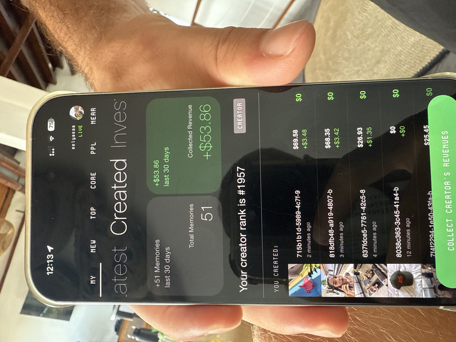 A human right hand, exhibiting a light skin tone and visible arm hair, holds a vertically oriented iPhone in an indoor environment within Tibubeneng, Indonesia. The iPhone's screen displays a dark-mode application interface. The top status bar indicates "12:13" as the time and a 75% battery charge. An in-app notification shows "eelyassaa LIVE" accompanied by a small profile icon. The primary application view, partially titled "Latest Created Invest," reports "+51 Memories" and "$53.86 Collected Revenue" over the last 30 days. It also states "Your creator rank is #1957" next to a "CREATOR" button. Below this, a scrolling list of created items is visible, each entry featuring a thumbnail image, a unique alphanumeric identifier (e.g., "715b1b1d-5989-4c7f-9"), a value (e.g., "$69.58"), an additional revenue figure (e.g., "+$3.48"), and a timestamp indicating recent creation, such as "2 minutes ago" or "12 minutes ago." A green button partially visible at the bottom reads "COLLECT CREATOR'S REVENUES." The background behind the hand features a light-colored, possibly painted, wall or partition, while the upper portion reveals dark brown wooden ceiling beams or slats, indicative of typical Indonesian architectural elements.