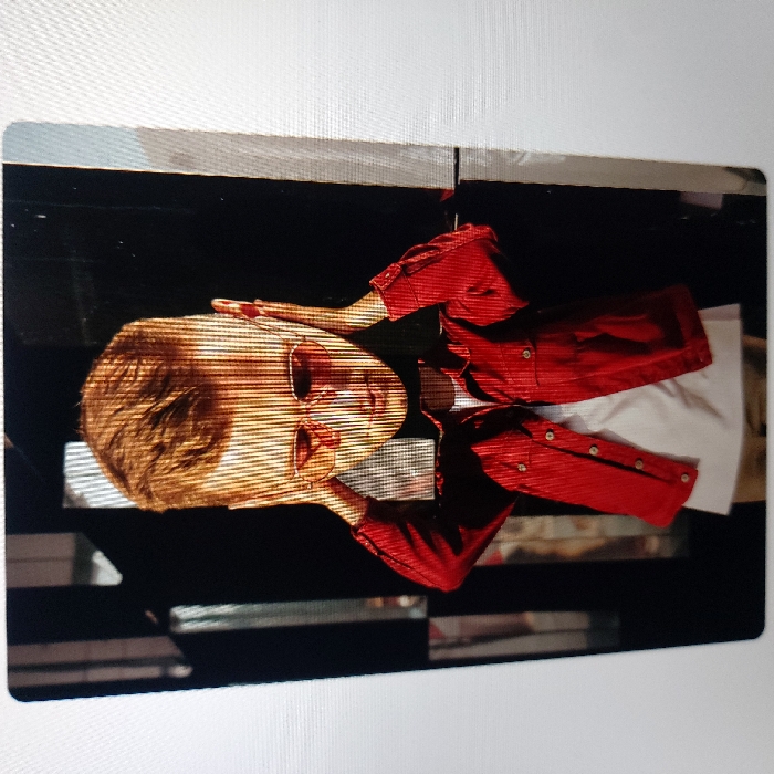 A portrait-oriented image depicts a single individual, likely a child or young adolescent, positioned centrally against a dark, predominantly black background. The individual has short, reddish-brown hair and wears red-tinted, round-frame sunglasses. Both hands are raised to the sides of the head, pressing against the ears in a gesture. The person is dressed in an open, red, possibly corduroy or ribbed, button-up jacket with two chest pockets, over a plain white t-shirt. Light-colored trousers or pants are faintly visible at the bottom of the frame. The background includes subtle reflections, suggesting dark, polished, or mirrored surfaces, with some geometric reflective elements visible on the left. Strong, uniform vertical light streaks are present across the entire image, notably over the subject's face and body, consistent with a photograph taken of a digital screen. There are no discernible visual cues within the image to identify its specific location within Gimpo-si (김포시), South Korea.