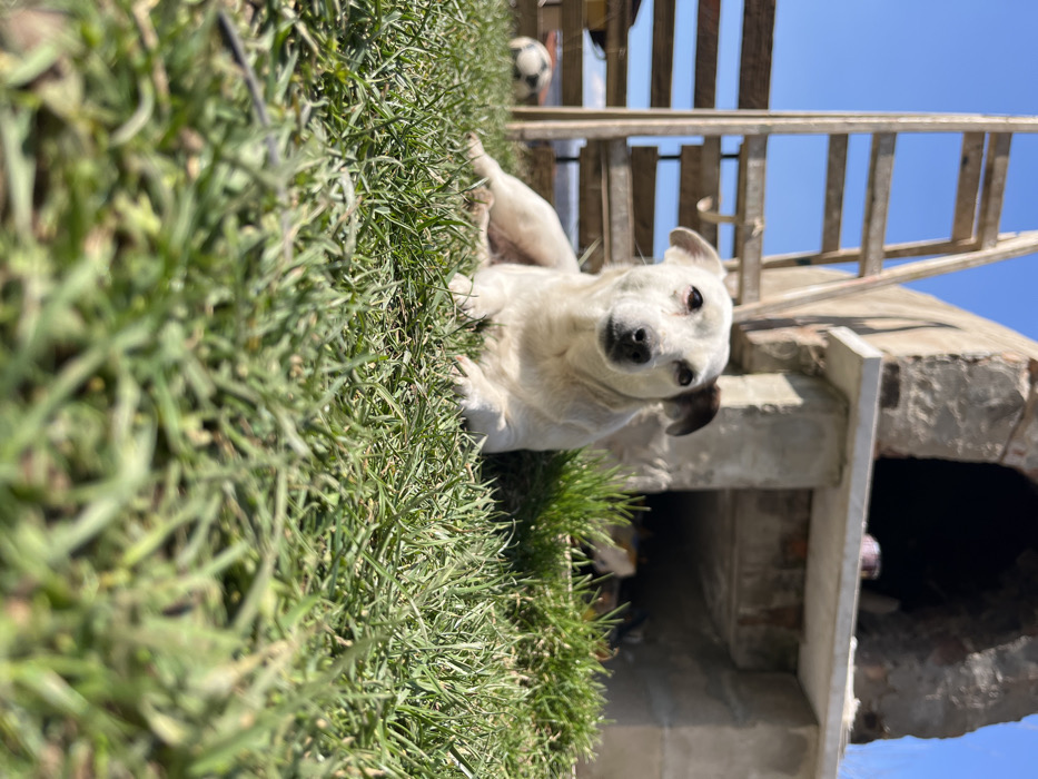 The image depicts an outdoor scene in Vladaya, Bulgaria, on a clear, sunny day. A short-haired white dog, featuring dark brown patches around its ears, lies on green grass in the midground, facing forward with its head slightly turned towards the left. Its front paws are extended in a resting posture. In the background to the left, a wooden ladder leans upwards, and a black and white soccer ball rests on the grass behind the dog. To the right, a weathered, rustic outdoor oven or fireplace structure, constructed from stone and concrete, stands with an arched opening at the top and a lower storage area containing indistinct items. The sky above is a bright, clear blue, indicating strong sunlight casting visible shadows on the ground and under the structures. No human individuals are present in the frame.