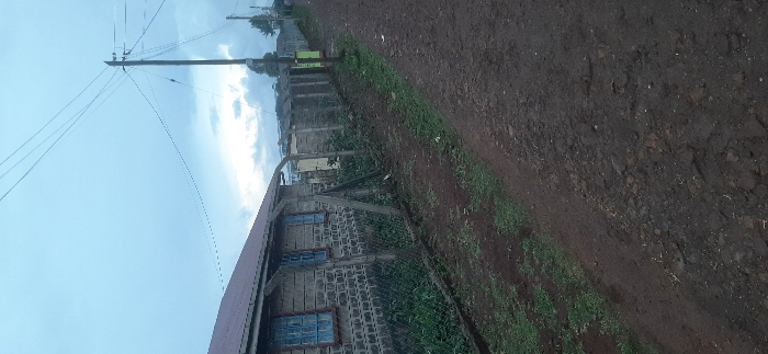 A rural scene features a weathered building with blue-framed windows alongside an unpaved road. The building is constructed from cinder blocks, and a fence stretches along its perimeter. Above, electrical poles and wires extend into a light blue sky scattered with faint clouds. The ground is a mix of soil and sparse greenery. A wall runs parallel to the road and building.