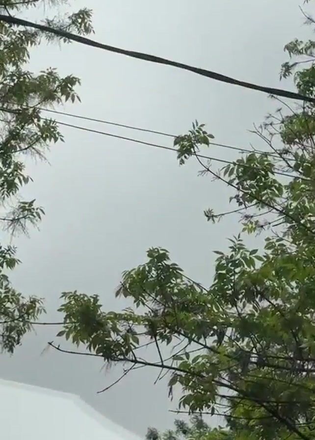 The video presents a view of a cloudy, overcast sky framed by tree branches and overhead power lines. The leaves on the branches are green. In the lower part of the frame, a blurry reflection of a building or structure can be seen. The camera seems to be pointing upwards, capturing the sky between the branches.