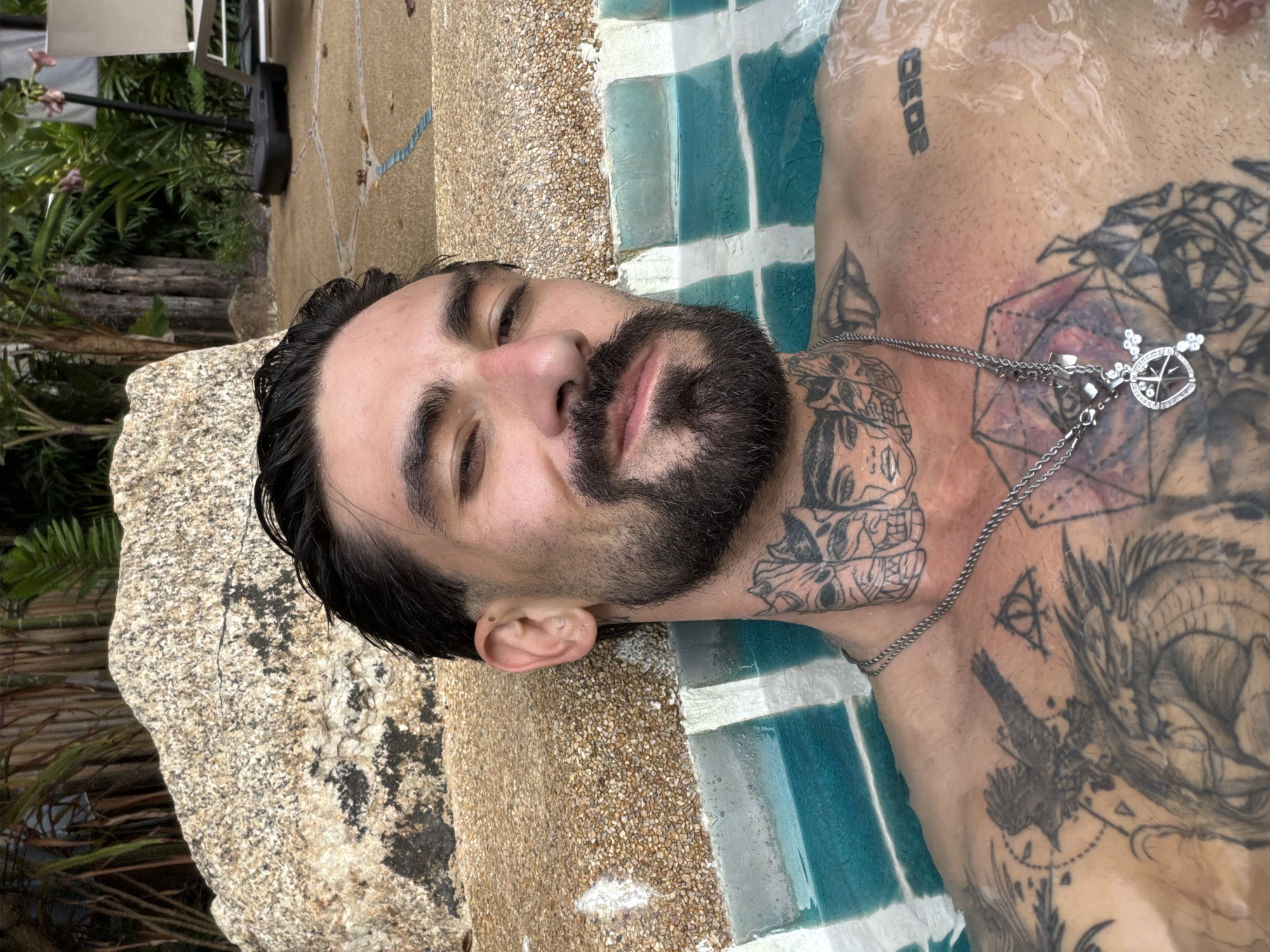 A single adult male is depicted in a close-up, chest-up shot, partially submerged in water, likely a swimming pool or hot tub