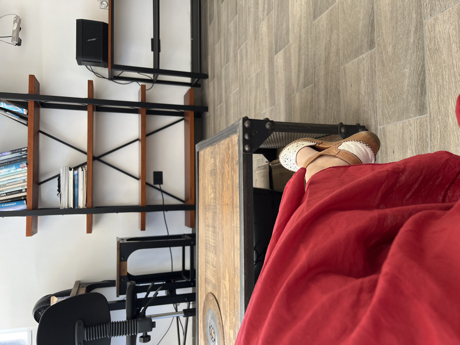 The image depicts an indoor scene in San Bernardino Tlaxcalancingo, Mexico. The perspective is from a seated individual, with their right leg prominently positioned in the lower left and center foreground. This leg is covered by a flowing, bright red garment and terminates in a light-colored, possibly white and tan, closed-toe sandal with intricate cutout patterns. In front of the observer is a rectangular coffee table featuring a distressed wooden top, dark metal edging, and exposed rivets at the corners. A circular, flat metal object is visible on the far left edge of this table. The background features white walls and light-toned, rectangular tiled flooring laid in a staggered pattern. To the left, a black office chair with an adjustable back is partially visible, alongside a dark metal stool with a wooden seat. A black desk fan is visible on a surface behind the chair. Centrally, a tall, five-shelf bookcase with a dark metal frame and wooden shelves stands against the wall. The top shelf holds several books, while the second shelf contains a stack of papers or magazines; the remaining lower shelves are empty. Electrical outlets are visible on the wall behind the bookcase. To the right, a smaller, dark metal console table with wooden shelves holds a black Bose speaker and a small, light-colored circular object. No other individuals are present.