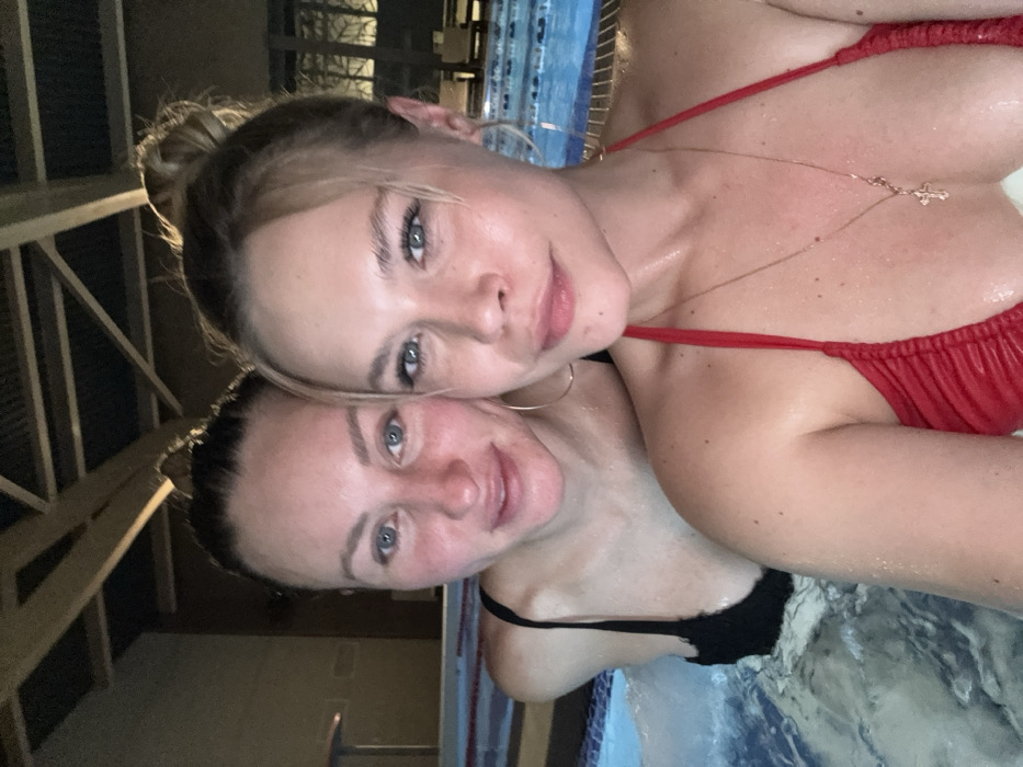Two fair-skinned women are posing closely together in what appears to be a pool or hot tub