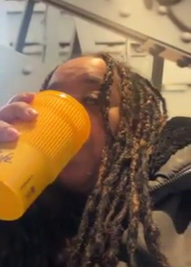 A woman with dreadlocks is drinking from a yellow McCafe cup