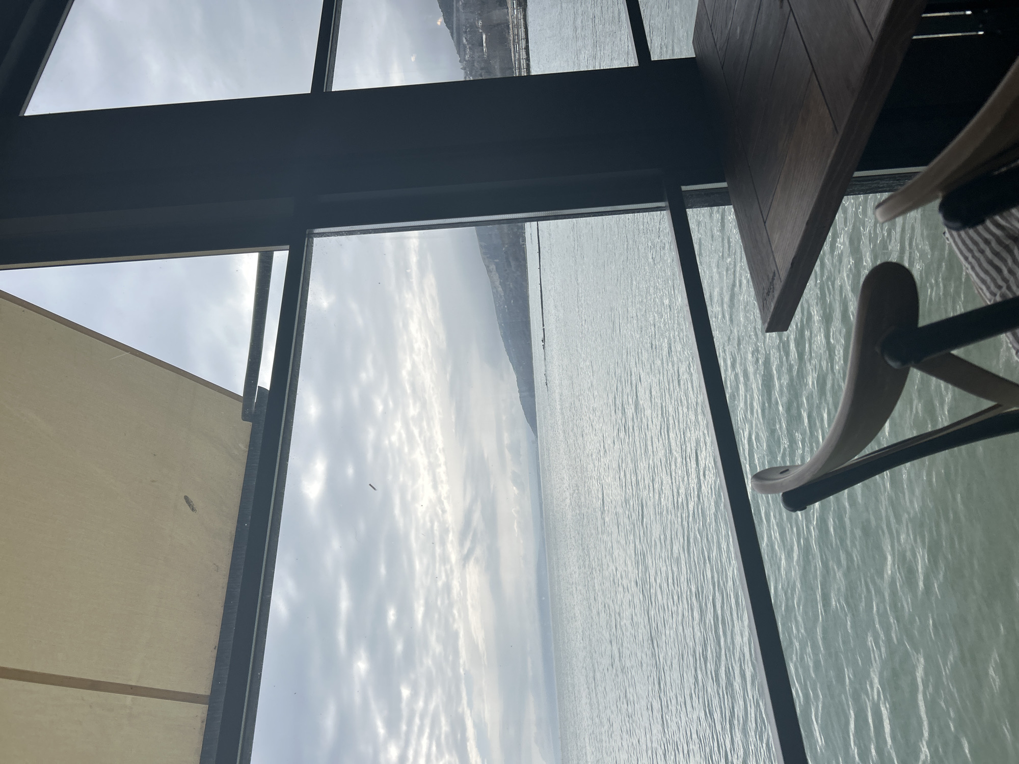 This image presents a view from inside a commercial establishment overlooking the Black Sea in Balchik, Bulgaria. The foreground features a dark-framed window system, through which the outdoor scene is observed. A light beige fabric awning is partially visible in the upper left corner, attached to a dark metal support structure. In the lower right, a square, dark wooden table with a distinct plank pattern is positioned, accompanied by the visible light-toned wooden backrests and dark frames of two chairs; one chair has a striped fabric item draped over it. Beyond the window, a calm, expansive body of water, likely the Black Sea, exhibits subtle ripples across its surface. The sky is entirely overcast with numerous grey clouds, indicating a cloudy or potentially rainy day. A distant coastline of hills or mountains is visible on both the left and right horizons. On the right side, faint outlines of buildings and what appears to be a pier extend from the distant shore into the water. A long, dark, linear structure, possibly a breakwater or marine barrier, extends horizontally into the water from the left mid-ground. A small, dark, elongated object is visible against the cloudy sky near the upper center, and another similar, smaller object floats on the water in the mid-distance. No individuals are present in the frame.