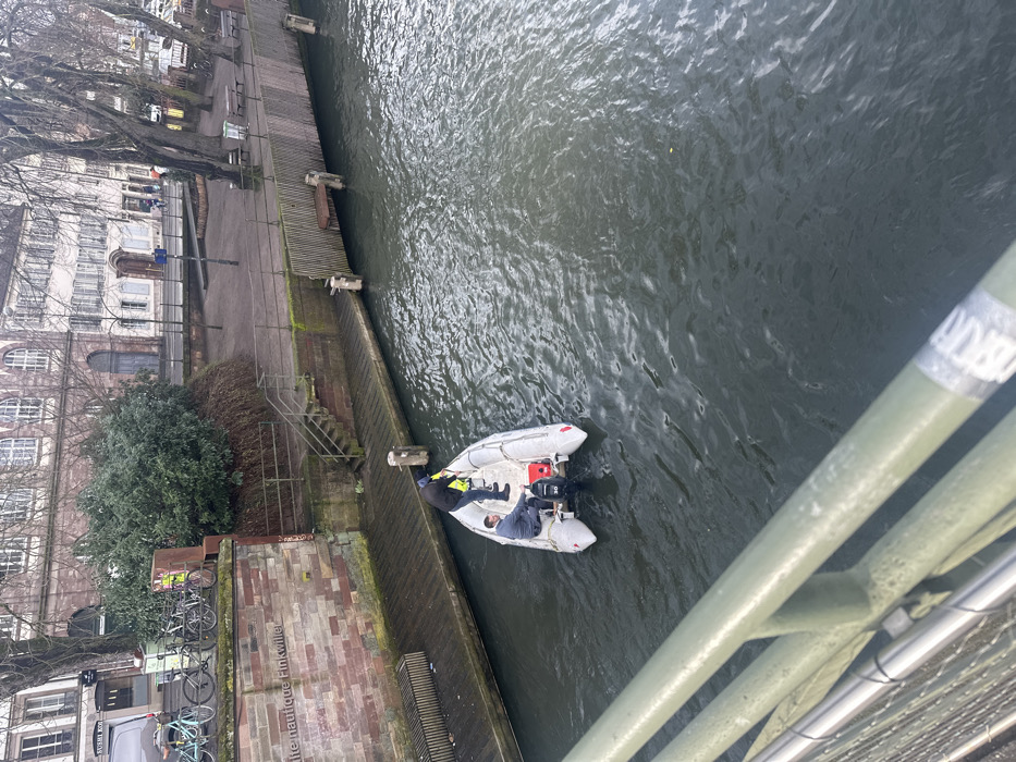 An elevated view from a bridge captures an active scene on the Ill river at Halte nautique Finkwiller in Strasbourg, France