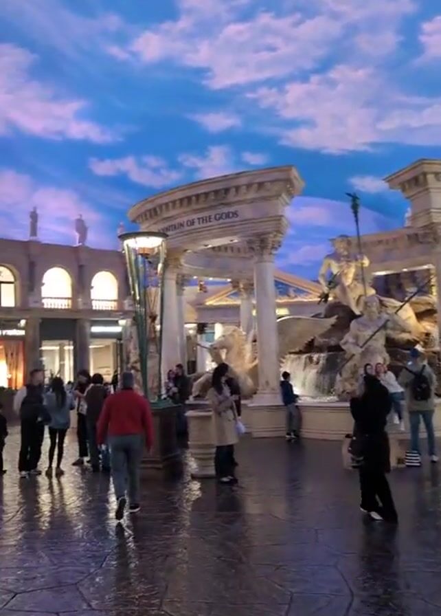 n indoor shopping area in what seems to be a luxury hotel or casino. The environment is decorated with Roman-inspired architecture, including a large fountain titled "Fountain of the Gods." Above the shopping area is a simulated sky with clouds. People are walking around, some are looking at the fountain, and others are gathered near seating areas. Luxury stores such as Louis Vuitton and Ferragamo are visible in the background. The floor is made of patterned stone tiles with a wet, reflective surface.