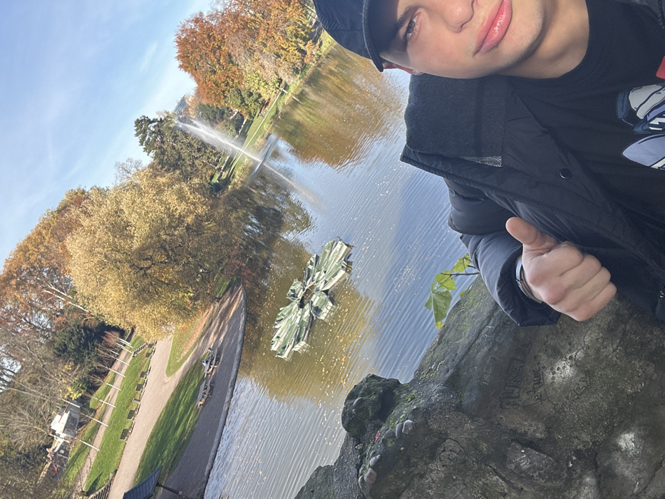 The image depicts a male subject taking a selfie in the Parc de l'Orangerie, Strasbourg, France, during autumn. The subject, positioned in the lower right foreground, is a young male with short dark hair, wearing a dark baseball cap, a dark puffy winter jacket over a graphic t-shirt, and a metallic watch or bracelet on his left wrist. He faces the camera with a neutral expression and offers a "thumbs up" gesture with his right hand. The background features a large, rippled body of water, likely the main lake in the park, reflecting a clear blue sky and autumnal trees. Scattered fallen leaves are visible on the water's surface. A distinctive green, multi-segmented floating structure, shaped like a flower or star, is present in the water to the left. Further back, a fountain shoots a vertical stream of water into the air. The far bank of the lake displays a park landscape with grassy areas, dirt pathways, and several dark park benches. Beyond these, a wider paved pathway ascends gently, lined with numerous deciduous trees displaying vibrant yellow, orange, and brown autumn foliage. Some trees appear bare. A small, dark-roofed structure is partially visible among the trees in the far left background. The foreground on the lower left consists of a dark, textured stone or concrete barrier with etched markings, from which a small green plant sprouts. The scene is brightly lit by natural sunlight, indicating a clear day. The image is slightly tilted.