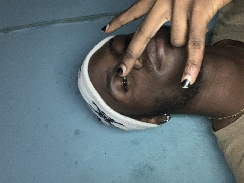 A man wearing a white headband with a black pattern lies on a blue surface. His head is tilted towards the viewer. A hand with painted black fingernails is positioned above his face. He has a nose ring and a hoop earring. A gold chain is visible around his neck. His eyes are partially closed.