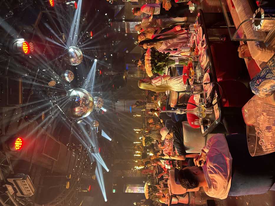A vibrant nightclub scene, illuminated by disco balls and spotlights. Tables are filled with patrons, enjoying drinks and hookah. Floral arrangements add to the festive atmosphere. Patrons are seated along the tables. The space is bustling with activity, creating a lively and glamorous ambiance.