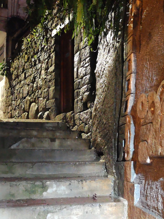 A stone staircase ascends, flanked by a rock wall to the left and a decorative, carved wooden structure to the right