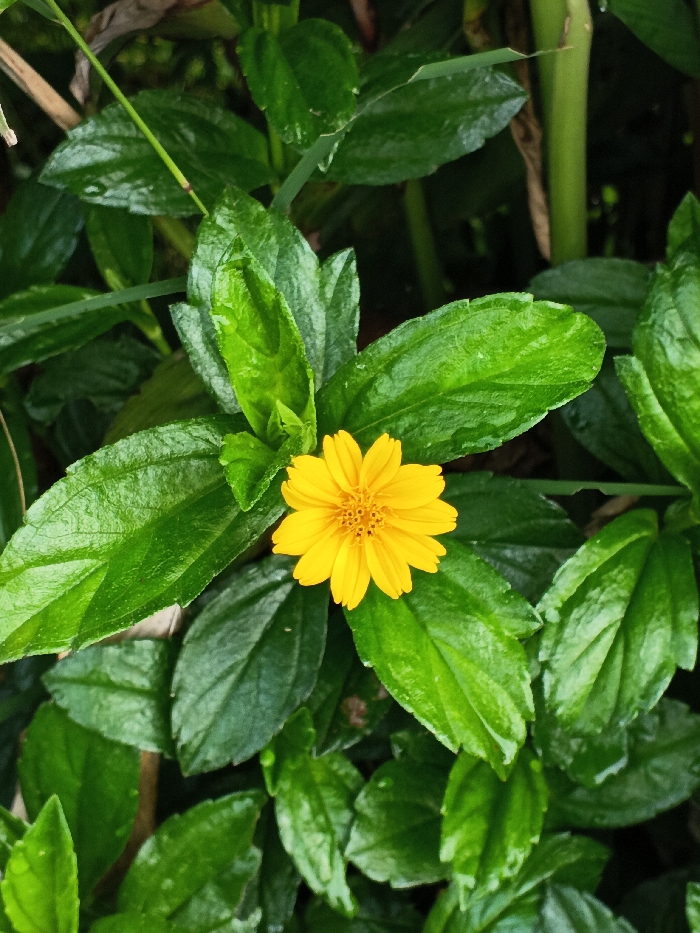 A vibrant yellow flower with numerous thin petals radiates from its center. The flower is nestled amongst glossy, deep green leaves, some reaching upwards. The leaves have a wet or waxy sheen, catching the light. Blades of grass are interspersed within the foliage. The overall impression is one of fresh, verdant growth punctuated by a bright splash of color.