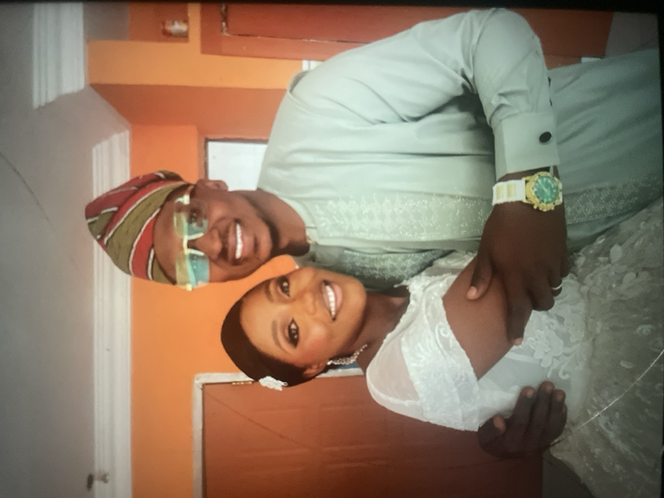 A man and woman, dressed in formal wear, pose indoors. The man wears a green long-sleeved shirt with embroidery, a colorful cap, and sunglasses. He is also wearing a watch. The woman, in a white, lace-covered dress, smiles. The background shows a wall painted half white and half orange. A door is partially visible in the orange section of the wall.