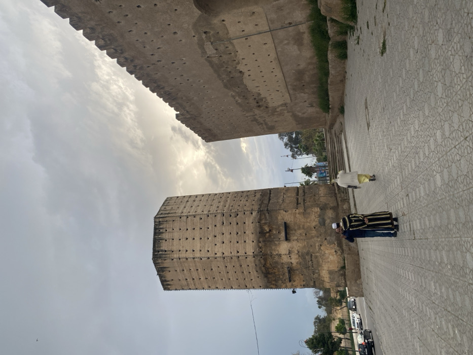 The image captures an outdoor scene near Borj Nord in Fez, Morocco, featuring historical fortifications under an overcast sky with a bright patch of sun