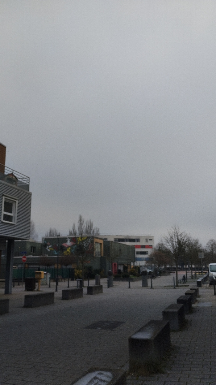 The image depicts an urban pedestrian area in Schiltigheim, France, under an overcast, light gray sky. In the foreground on the left, a portion of a modern building with light-colored horizontal siding and a visible window is present. Below it, a red circular "No Entry" sign is mounted on a pole. The ground is paved with interlocking pavers, leading into the midground. Dark, rectangular concrete blocks serve as benches or barriers, lining the paved surface, with some displaying a light dusting of frost or snow. In the midground, a building with a large, colorful mural featuring abstract designs and an arrow motif is visible. A yellow postbox stands near this building. Numerous bare deciduous trees are scattered across the midground. Dark gray cylindrical bollards are spaced along the paved area. In the distance on the right, a white van is partially visible. One extremely indistinct, dark figure is remotely discernible on the right side of the midground, its activity or features not clear. In the background, a larger, multi-story building with white, red, and blue striped sections is visible, along with other architectural structures. The scene appears static, with minimal discernible human activity.