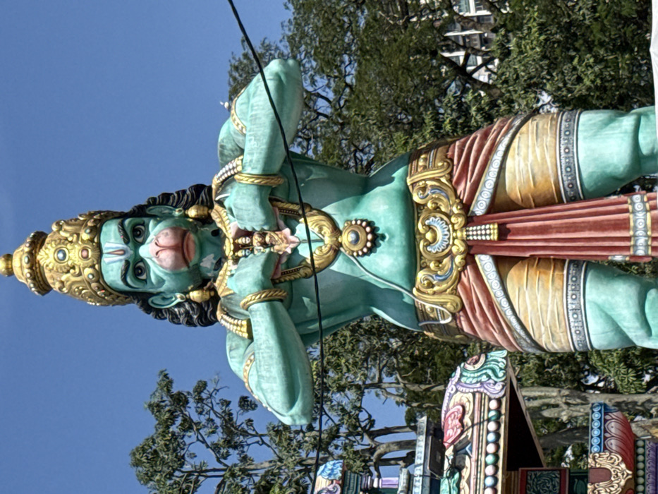 A towering, teal-skinned statue of Hanuman, the Hindu monkey god, dominates the frame