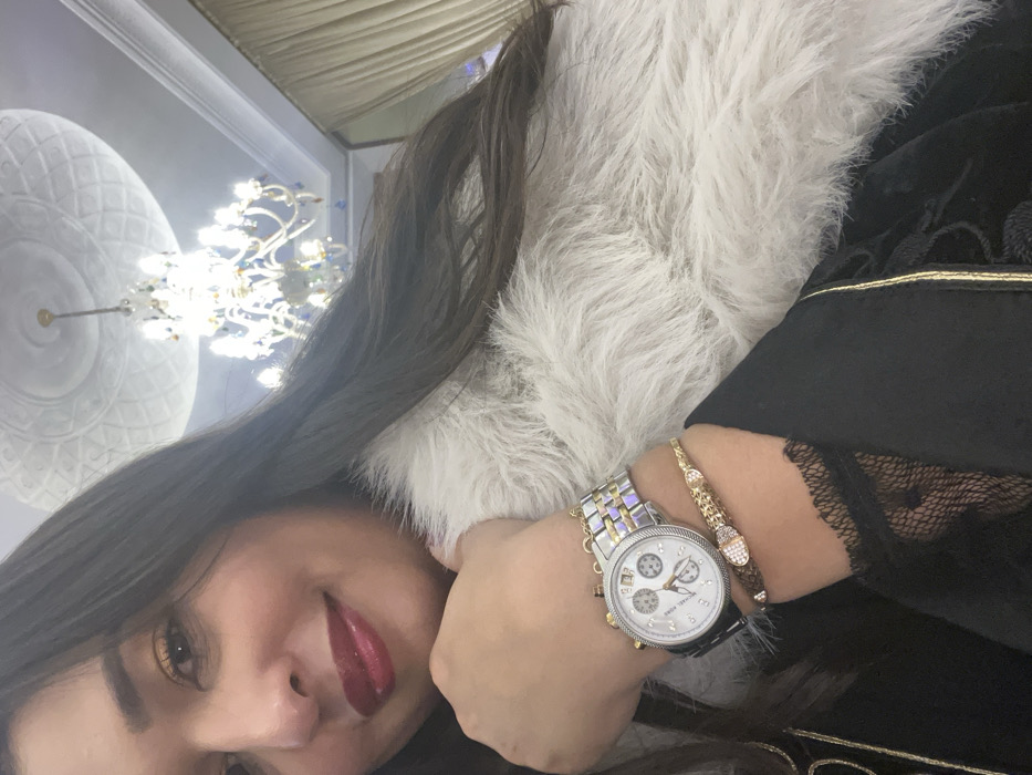 A woman's selfie reveals a portion of her face, with glossy burgundy lips. Her arm is adorned with a silver and gold watch along with a golden bracelet with rhinestone accents. She is wearing a black lacy robe trimmed with gold and has a white fluffy item by her. The backdrop features an ornate white ceiling design, and an elegant chandelier.