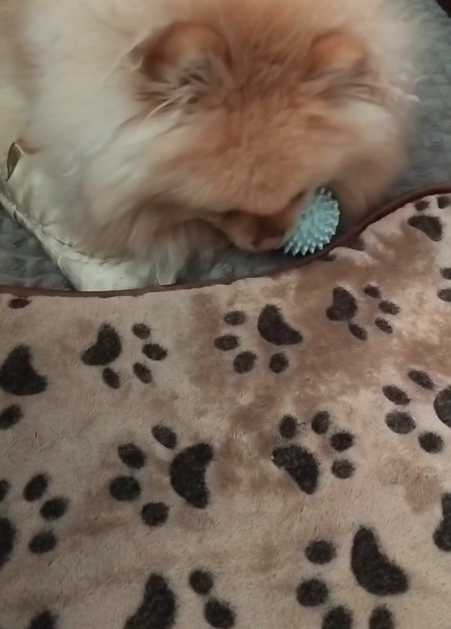 A fluffy, light brown and white Pomeranian dog is lying in a dog bed and chewing on a small, light blue, spiky ball. The dog bed is patterned with dark brown paw prints on a light brown background and is partially on top of a dark gray surface.