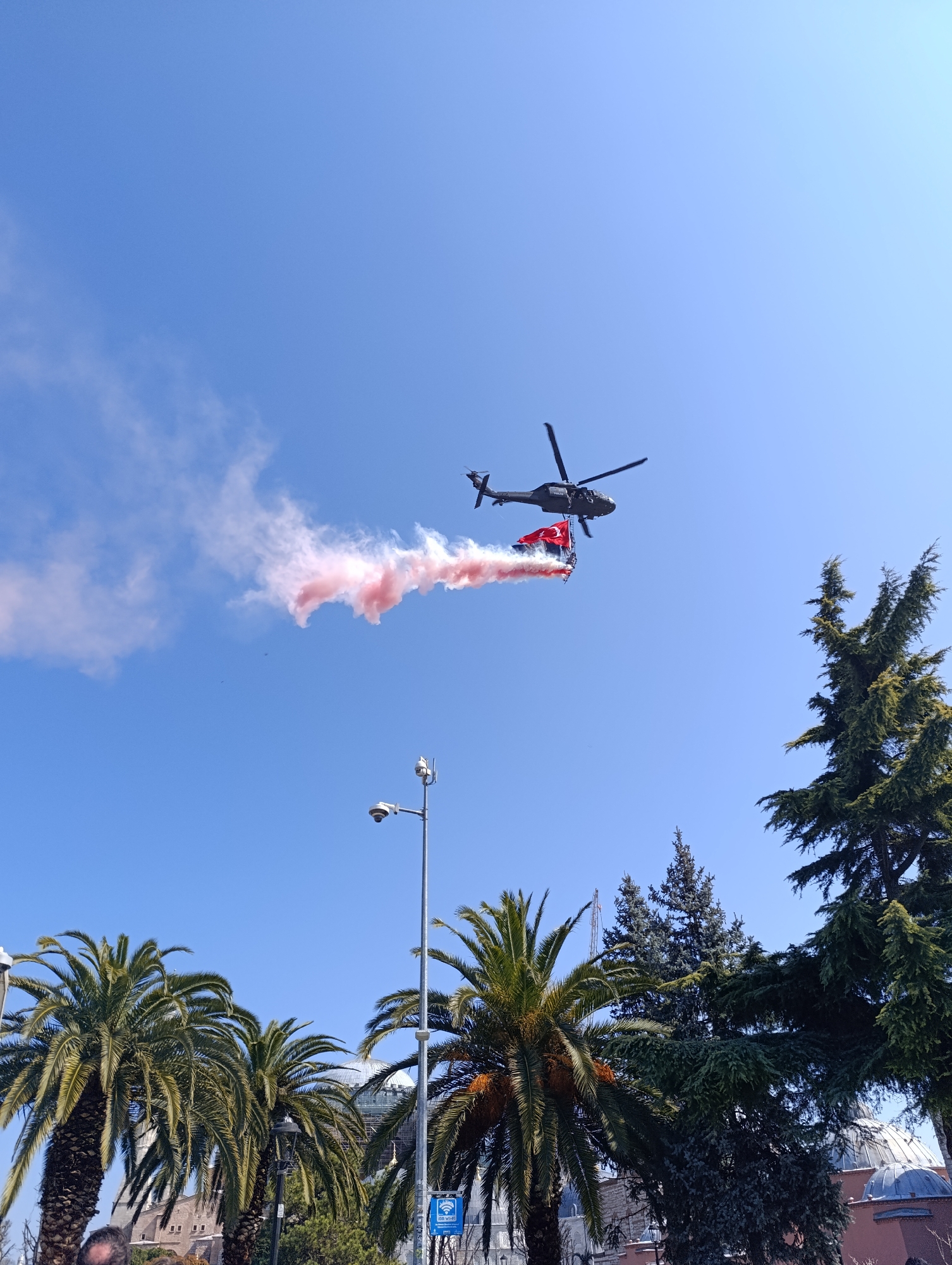 - "A low-angle outdoor shot shows a helicopter in mid-air against a clear blue sky, pulling a large Turkish flag and a red smoke trail" by FM-P9qXD3, licensed under CC BY 4.0