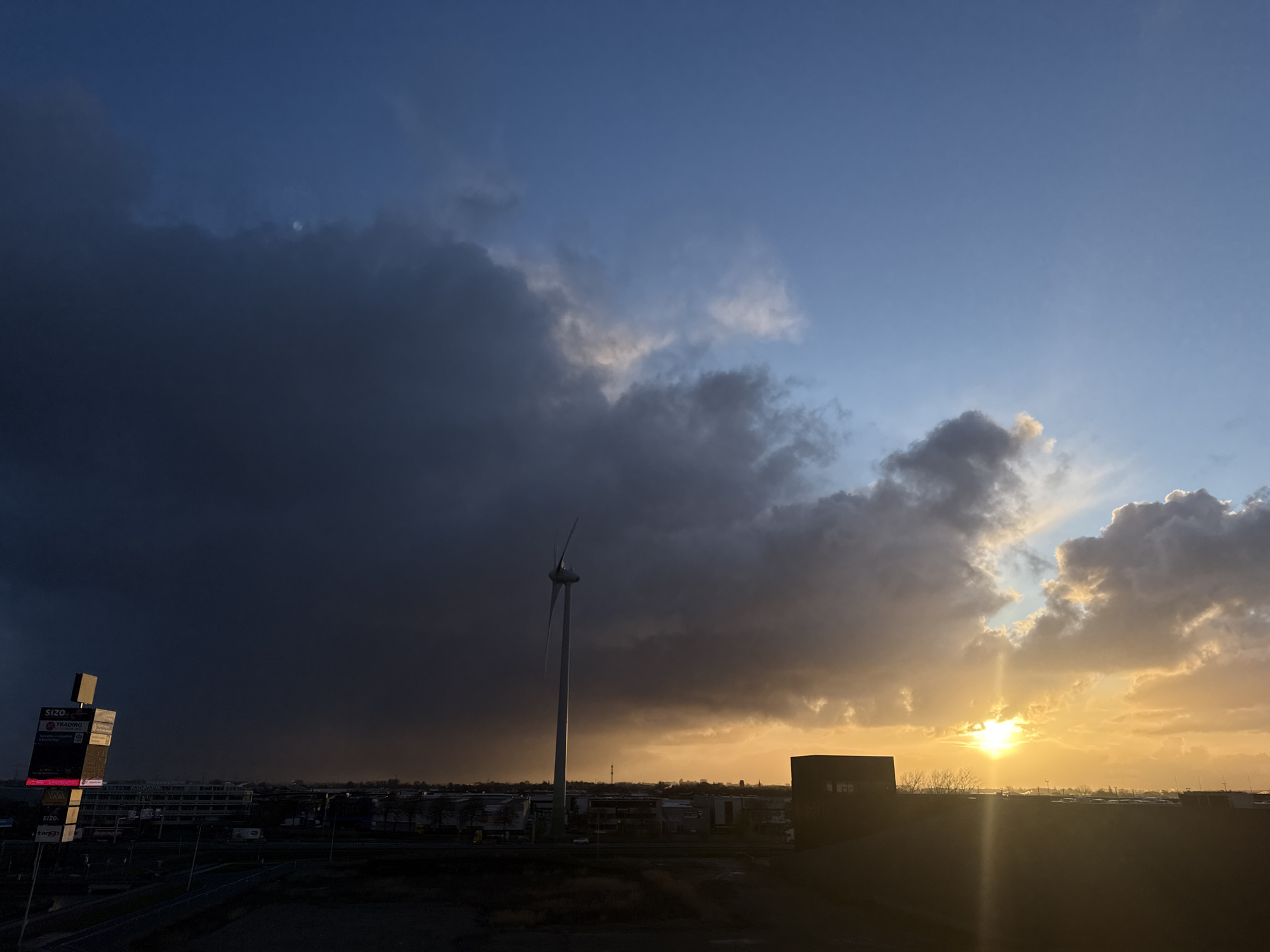 This image depicts a panoramic view of an industrial park in Naaldwijk, Netherlands, during sunset or late afternoon. The sky is characterized by a stark contrast: a substantial, dark grey cloud mass dominates the left half, appearing to bring heavy weather and subtly revealing a faint, circular object (likely the moon) through its density in the upper left. The right half of the sky exhibits scattered clouds illuminated by the low-lying sun, casting a strong golden-orange hue, with clear blue sky visible towards the top right. A tall, three-bladed wind turbine, light grey in color, stands prominently slightly left of the image's center, its upper portion extending into the dark cloud mass. To the far left, a tall, multi-panel advertising signpost, partially shadowed but with illuminated sections, displays text including company names such as "SIZO," "TRADIRO," and "TanGO." Below the horizon line, the landscape is occupied by numerous low-rise industrial and commercial buildings, along with visible roads and infrastructure. The immediate foreground consists of a dark, elevated landmass. No individuals or active vehicles are discernible. The scene is observed from an elevated perspective, overlooking the `Bedrijvenpark Honderdland` industrial area, likely facing an easterly or southeasterly direction.