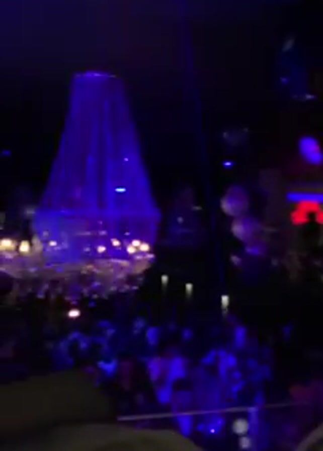 dimly lit nightclub with chandeliers and balloons hanging from the ceiling. There are people visible in the background, but they are blurred and indistinct. The camera is shaky and moves around, making it difficult to discern details. The lighting is mostly blue and purple.