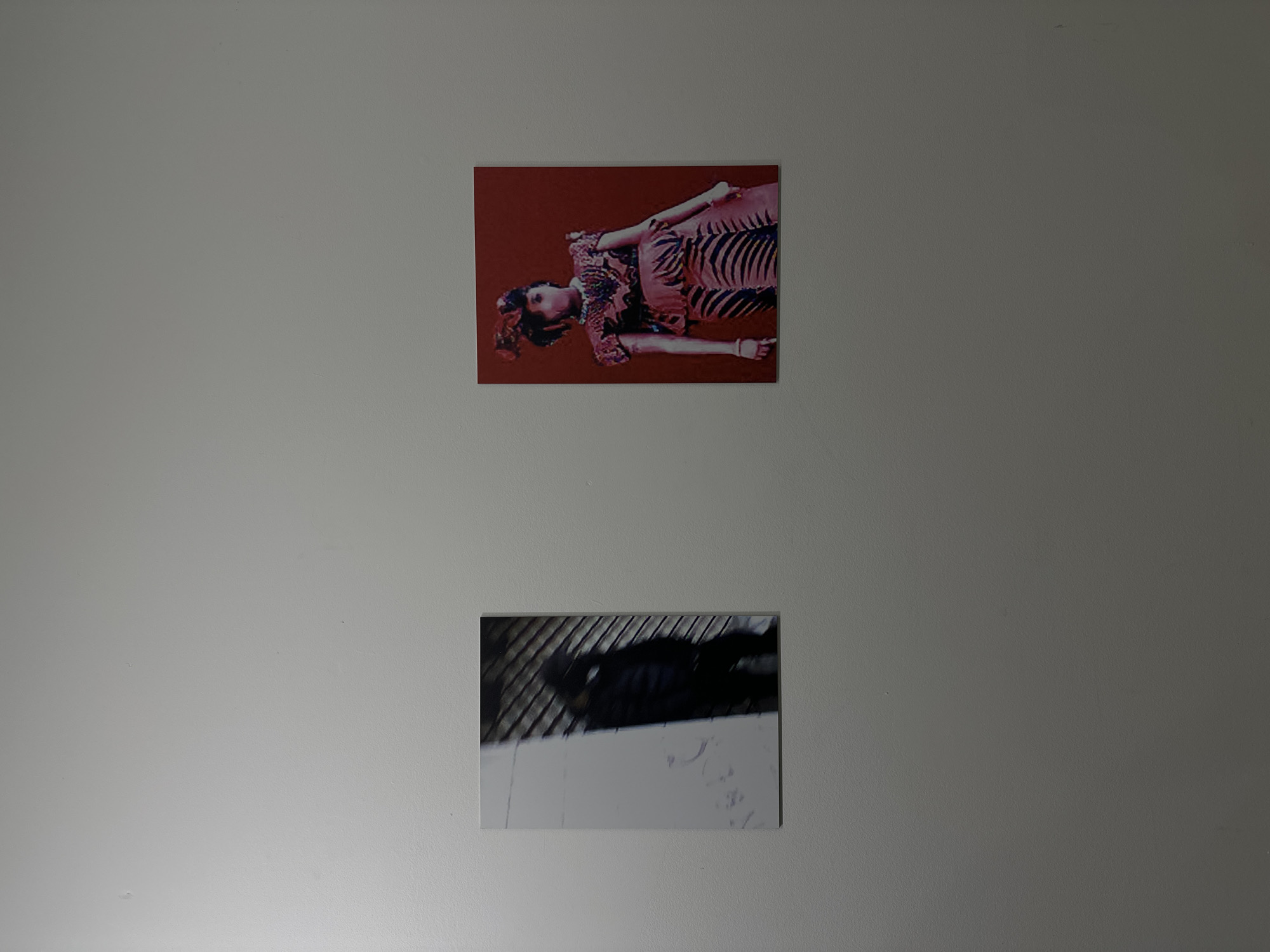 The image displays an interior exhibition space, located in Paris, France. A plain, light grey wall serves as the background for two rectangular art prints, centrally positioned and spaced apart. The print on the left, oriented vertically, depicts a dark, blurred humanoid figure against a backdrop of vertical and diagonal lines, rendered in a grayscale palette with hints of dark blue. The print on the right, also vertically oriented, features a vibrant red background. It showcases a stylized female figure adorned in an elaborate, patterned dress with a ruffled peplum, a beaded necklace, and bracelets. Her hair is styled with an intricate headdress, possibly incorporating floral elements. The figure's attire and skin tones are rendered in shades of red, pink, and dark purple. Both prints are of comparable size and are mounted at approximately the same vertical height on the wall.