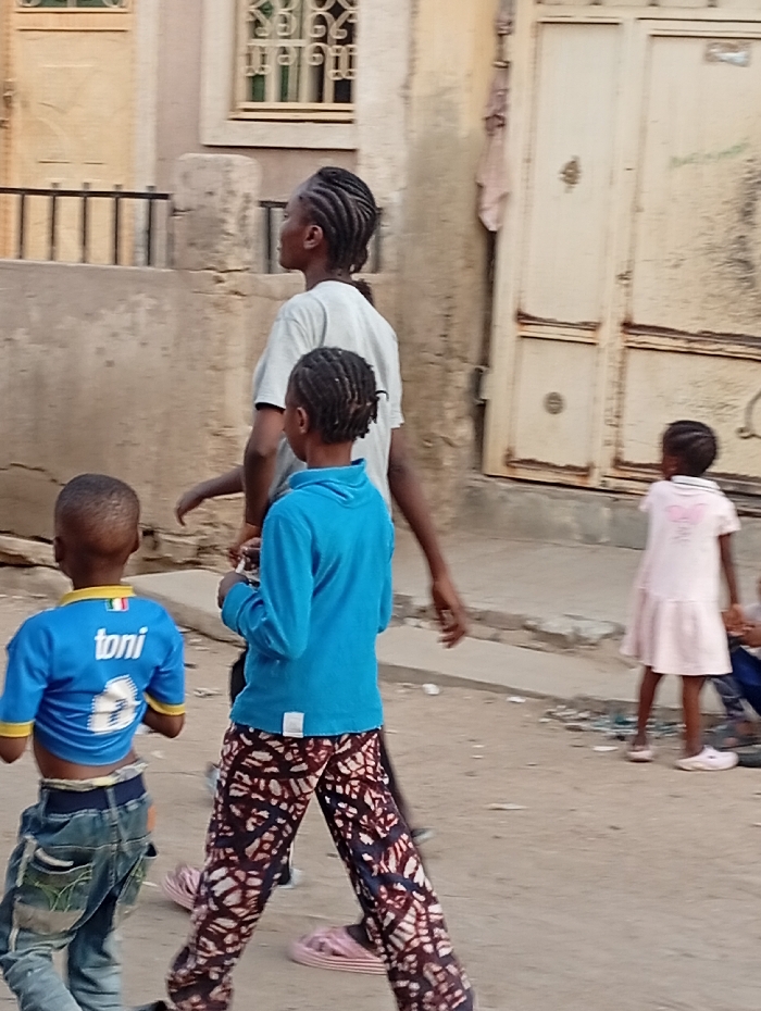 The scene depicts an outdoor urban environment in Gwagwarwa, Nigeria. Four individuals are prominently featured, with a fifth partially visible. The ground is unpaved, appearing as dirt or dusty earth. On the far left, a young male child, viewed from the back, wears a blue short-sleeved shirt with yellow trim, displaying "toni 2" in white text on the back. His lower back and midriff are exposed above light-colored, worn denim jeans. He moves towards the left. Immediately to his right, a second child, viewed from the back and slightly to the right, wears a long-sleeved bright blue top and dark trousers with a white and reddish-brown abstract pattern. Pink striped sandals are visible on their feet. This individual is in mid-stride. Behind the second child and to the right, an adult or older youth, facing right in profile, has dark braided hair pulled back. They wear a light-colored short-sleeved top and dark trousers (mostly obscured) and pink sandals similar to the second child. They appear to be walking forward. In the right background, a young female child, viewed from the back, wears a light pink short-sleeved dress with a white design on the chest. She is also in motion, moving to the right. The lower legs of a fifth individual, wearing dark trousers and shoes, are visible crouching or sitting in the bottom right corner. The background consists of weathered building structures. To the left, a light-colored wall with a black metal railing and a window featuring a decorative metal grille is visible. To the right, a tall, distressed, light-colored metal double gate with visible rust and wear occupies a significant portion of the background. A light-colored cloth hangs from the wall adjacent to the gate. The overall lighting is soft and natural.