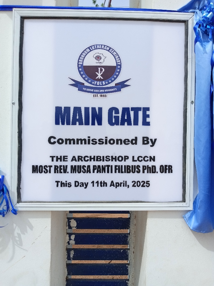 white plaque mounted on a white wall with blue ribbon decorations on either side. The plaque is framed in silver and reads "MAIN GATE Commissioned By THE ARCHBISHOP LCCN MOST REV. MUSA PANTI FILIBUS PHD. OFR This Day 11th April, 2025". The top left corner of the plaque features a circular emblem with the words "BRANHUM LUTHERAN SEMINARY" written around its circumference. The emblem also includes a cross symbol, the letters "LCCN" and "VOLA". The inscription below the emblem reads "TO SERVE GOD AND HUMANITY EST. 1985". The coordinates 9.187, 12.525 correspond to the location of Rumde Waziri in Nigeria. The plaque is likely commemorating the opening of the main gate to the Branhum Lutheran Seminary.
