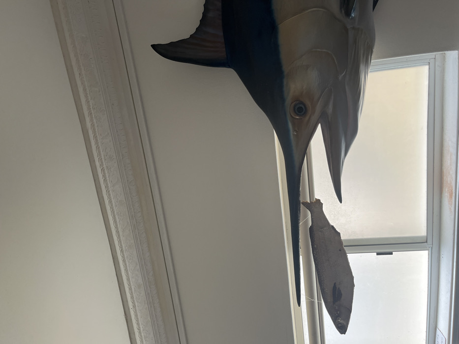 An ornate decorative molding adorns the left side of the frame. A large, mounted marlin fish with a smaller, secondary fish impaled on its spear is the image's focal point. The marlin is predominantly blue and white. A window with a white frame sits in the background, adding a source of light that illuminates the fish and surrounding wall.
