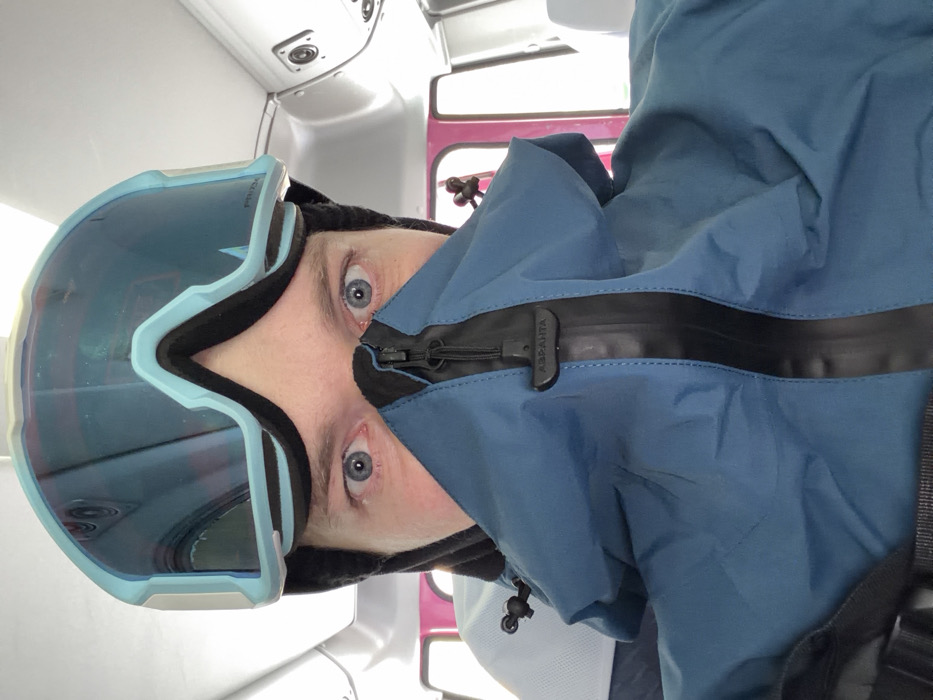 A person wearing blue ski goggles and a zipped-up blue jacket is captured in a close-up shot. Their eyes are visible, and the jacket's zipper pull is labeled 'AZPANTA.' The background suggests an indoor setting, possibly a vehicle. The person's head is slightly tilted, adding a dynamic angle to the composition.