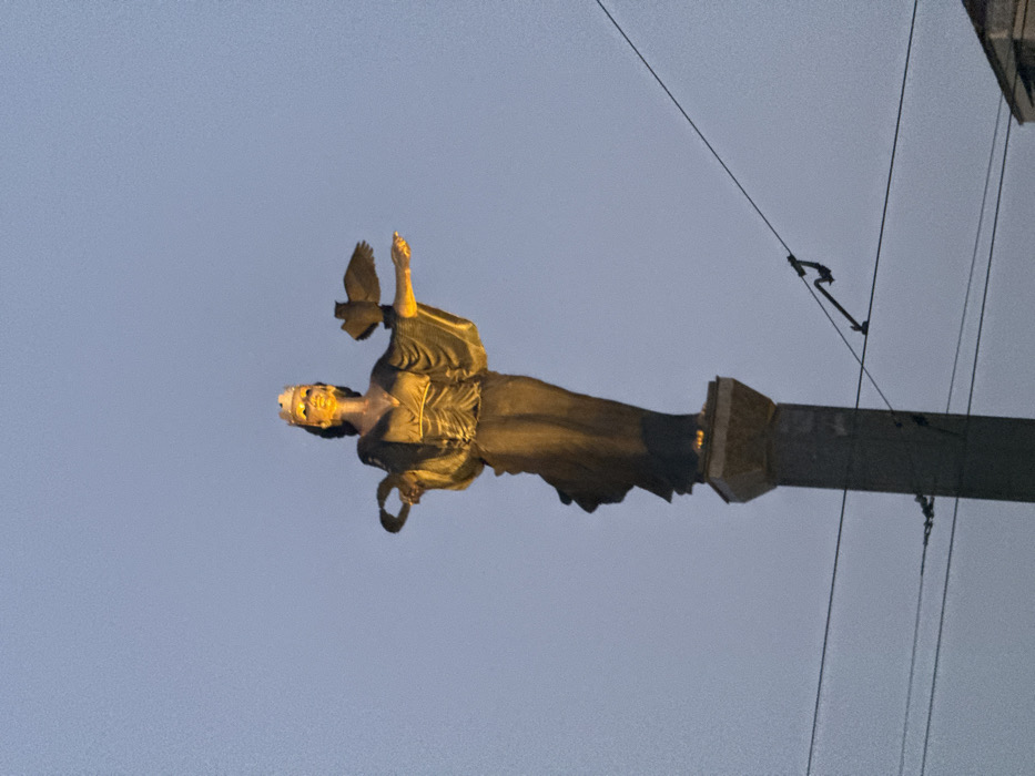 The image depicts the Monument to Saint Sophia, located in Nezavisimost Square in the city of Sofia, Bulgaria. The central subject is a tall, bronze statue of a female figure, illuminated by warm, golden light against a dim, uniform grey-blue sky. The figure wears a long, flowing gown and a crown. Her eyes are obscured, possibly by a blindfold or reflective material. She holds a laurel wreath in her left hand and supports a perched owl with slightly spread wings on her extended right arm. The statue stands on a tall, multi-tiered dark stone pedestal. In the foreground, below the statue, multiple black overhead electrical wires, characteristic of tram or trolley infrastructure, traverse the frame horizontally and diagonally. A small portion of a light-colored building roof is visible in the lower right corner. The scene is static, devoid of active human presence.