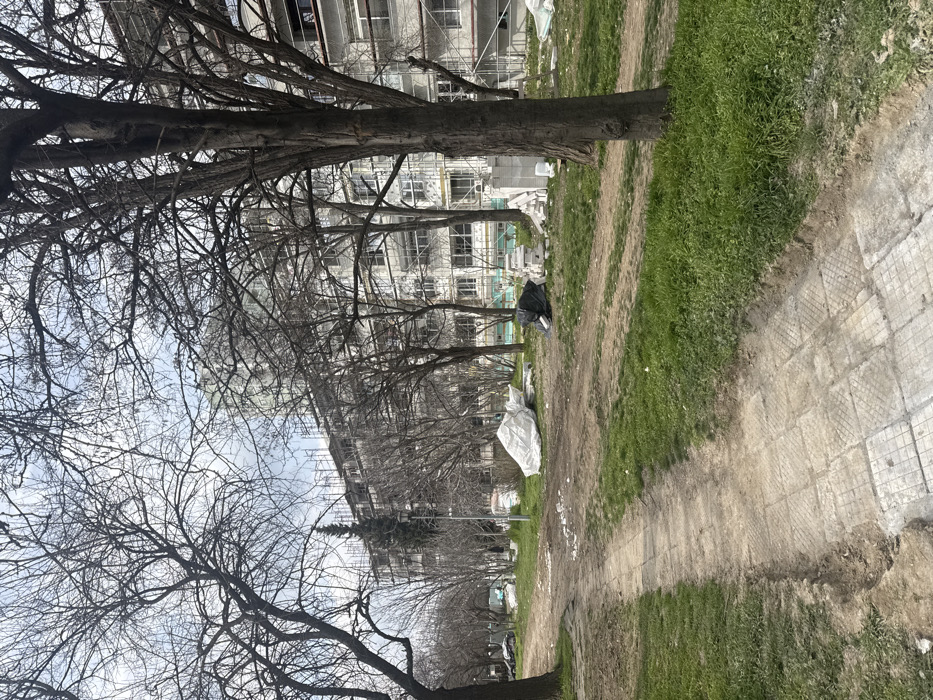 The image presents an urban outdoor scene in a residential area of Plovdiv, Bulgaria, during what appears to be late winter or early spring. The foreground features a worn pedestrian path, partially composed of square, textured grey concrete pavers, transitioning into a dirt track that recedes towards the mid-ground. The ground surrounding the path consists of bare earth and patches of light green grass, interspersed with small scattered white debris. Two prominent bare deciduous trees frame the scene, one on the far left and a thicker-trunked tree in the right foreground, with their intricate branch networks silhouetted against a cloudy, light blue sky. In the mid-ground, adjacent to the dirt path, several items associated with construction are visible. These include a large, irregular mound covered in a white tarp, a smaller pile wrapped in black sheeting, and a stack of rectangular, light-colored blocks, likely building materials or insulation panels. A single-armed street light pole is also visible in the distance, slightly left of center. The background is dominated by multiple multi-story residential buildings, characteristic of post-socialist era architecture. These light-colored structures are extensively covered with metal scaffolding, indicating ongoing renovation, likely involving facade work or external insulation. Numerous windows and balconies are discernible through the scaffolding. A taller, lighter-toned building is partially visible behind and above the primary residential blocks. No individuals or active interactions are present in the scene. The specific street or precise neighborhood within Plovdiv is not identifiable from the visual information provided.