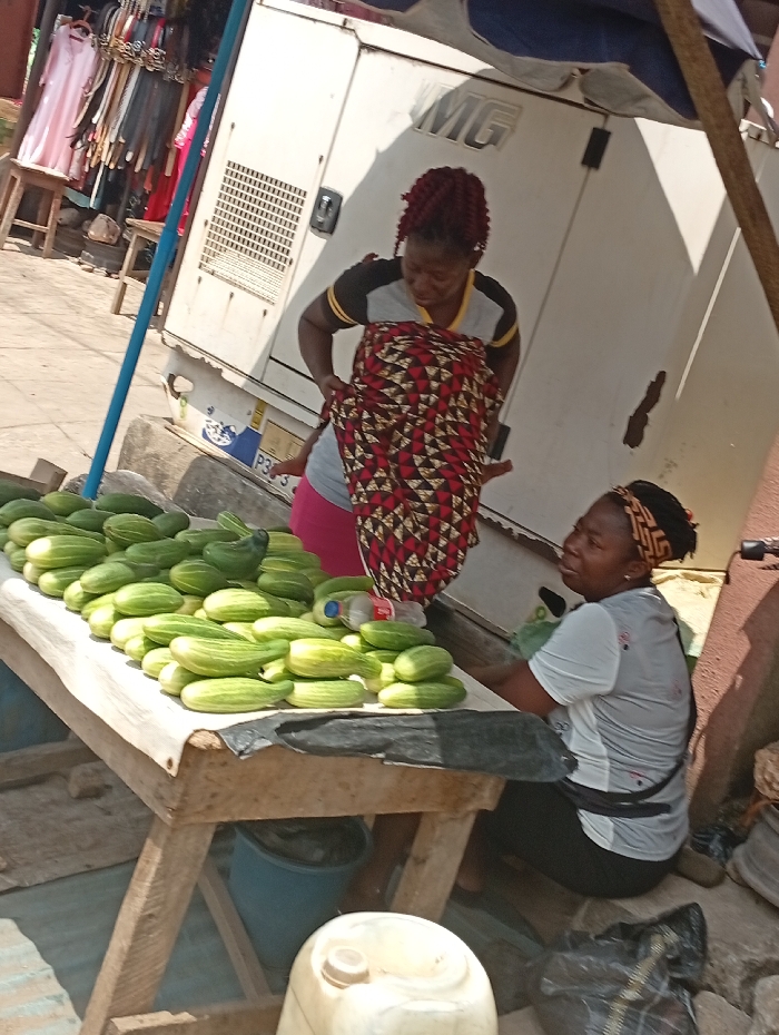 Two women are selling cucumbers at a market. One stands behind the table laden with cucumbers, carrying a baby wrapped in colorful fabric. She has reddish hair and wears a gray top with a black collar. The other woman squats behind the table, wearing a gray shirt, black pants, and a patterned headband. She looks towards the cucumbers. A white generator sits behind the women, and clothing racks are visible in the background.