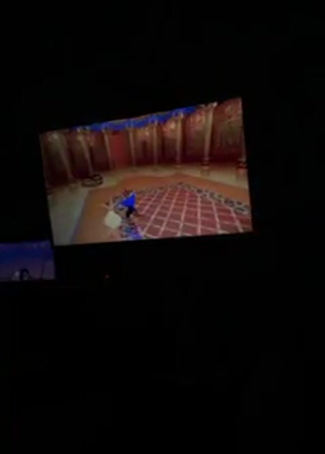 A dark room shows a television screen with the scene from "Beauty and the Beast" playing. Belle and the Beast are dancing. The scene is a room with a red and tan checkered carpet, tan walls with painted scenes, and draped blue fabric above. The screen is the primary light source in the dark room.