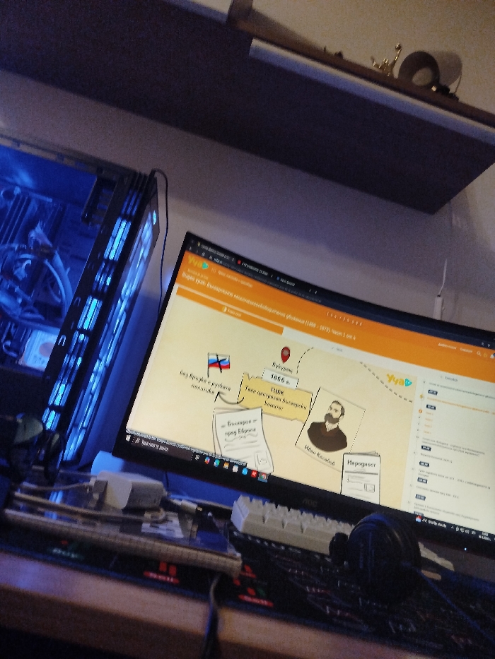 The scene depicts a desktop computer setup in an indoor environment, likely a study or bedroom, located in Mirovyane, Bulgaria. A curved, widescreen monitor occupies the center-right of the frame, displaying an educational webpage from "Уча.бг" (Ucha.bg) in Bulgarian. The webpage features a diagram with text, a Russian flag, a drawing of a bearded man labeled "Иван Вазов" (Ivan Vazov), and graphical elements related to historical content (e.g., "Българско възраждане" - Bulgarian Revival, "1866 г."). To the left of the monitor, a desktop computer tower with blue internal LED lighting is visible. In the foreground, positioned on a desk, a white mechanical keyboard is present, with black over-ear headphones resting on its right side. A white power adapter or charger is placed on a spiral-bound notebook or stack of papers directly in front of the monitor. The desk surface is covered by a patterned mousepad. Above the monitor, a dark wall-mounted shelf holds several small, metallic decorative objects. The overall lighting is dim, with significant illumination originating from the monitor and the PC tower's internal lights. No individuals are present in the image.