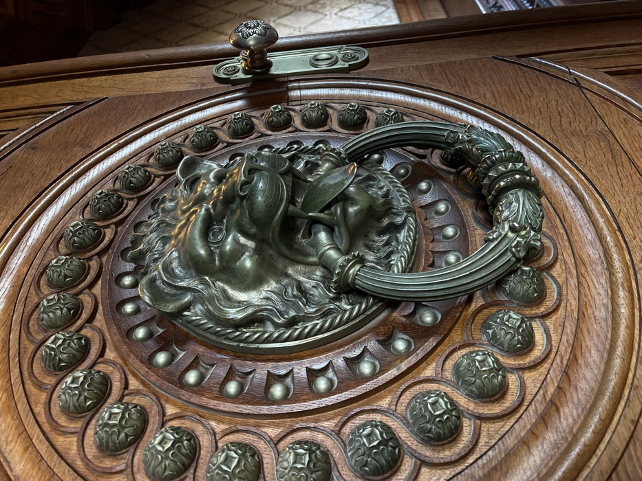 A detailed, ornate wooden door features a prominent lion's head door knocker