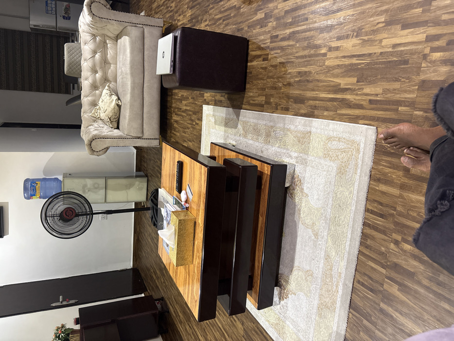 A furnished living room features a tufted sofa next to a dark brown ottoman. A multi-tiered wooden coffee table sits on a patterned rug in the room's center. An electric fan stands near a water dispenser and a small cabinet. A dark door is visible on the left side, adjacent to a low shelf with decorative plants. A person's feet can be seen to the right of the rug. The room has wood-patterned flooring.