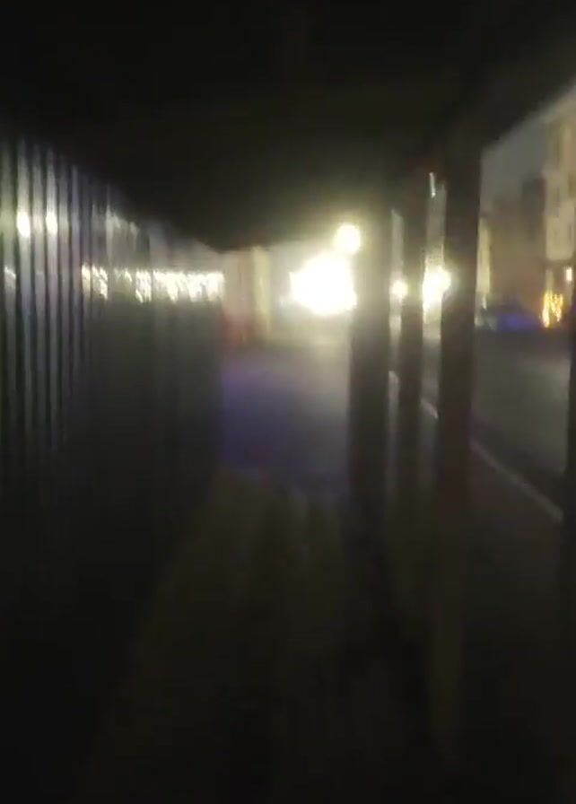 dark and obscured perspective looking down a narrow passageway. On the left is a corrugated metal wall that seems to be part of a temporary structure. On the right, there are posts or poles lining the edge of the passageway. At the end of the passageway, there's a street with lights; the light is diffused, possibly by fog or mist. The overall setting gives the impression of an urban area at night. The camera appears to be held by someone walking or moving slowly through the space. The primary action is the gradual forward movement.