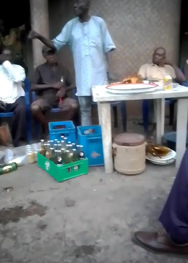 gathering of older men outdoors, seemingly at a casual social event. Several men are seated in chairs, while one man stands and gestures, possibly addressing the group. There are crates of bottled beverages on the ground, as well as some empty bottles scattered around. A table with food on it is also visible. The environment appears to be a simple outdoor space, perhaps a courtyard or patio.
