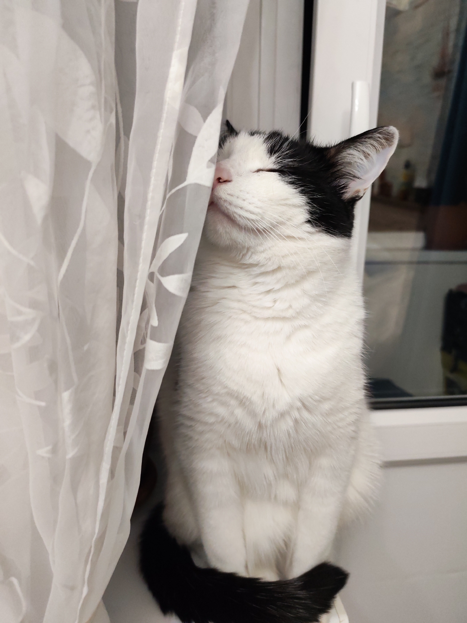 A black and white cat sits in front of a white curtain. The cat's eyes are closed, and its nose is touching the curtain. The window has a white frame and is partially visible behind the cat. The scene is lit by natural light. The reflection in the window is blurry but suggests an urban environment. The image was taken in Chaikovsky, Russia.