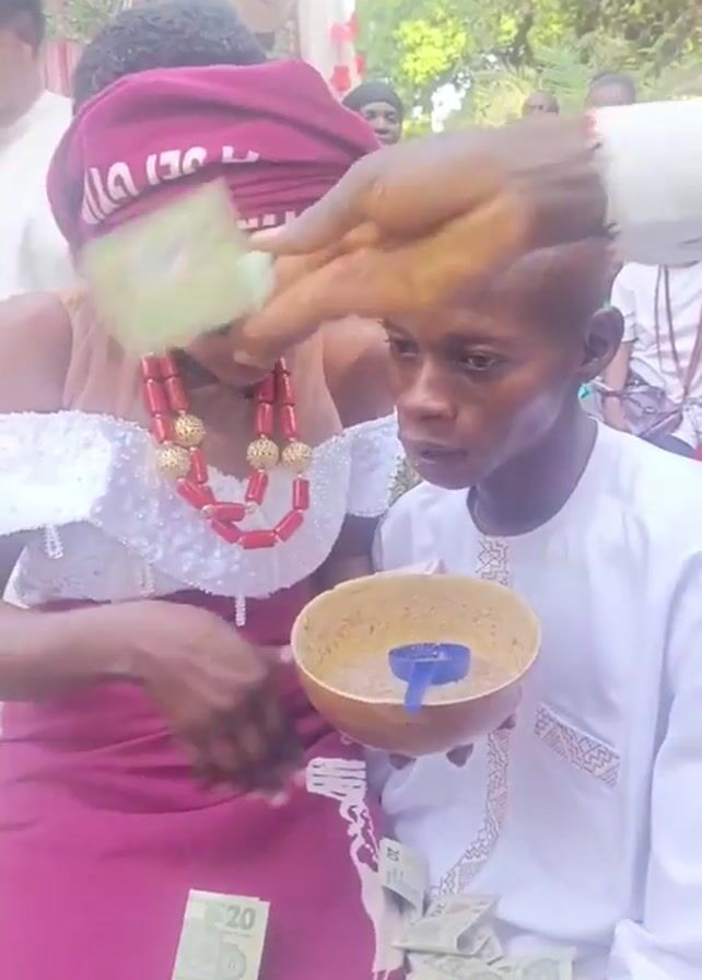 In a medium shot, a woman and a man are seen participating in what appears to be a traditional wedding or cultural ceremony