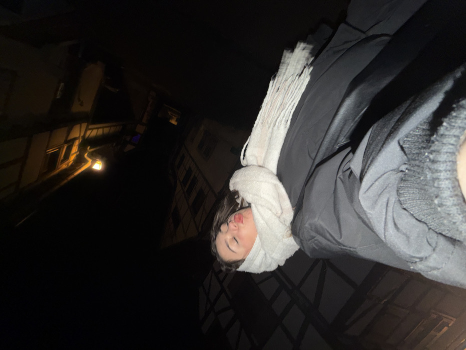 A woman with a white scarf around her head poses with pursed lips. She wears a black coat and a gray sweater. The background consists of dark, narrow streets with buildings that have distinctive timber framing. One building has a lit window with a warm glow. It is night and the photo has a dark, shadowy quality.